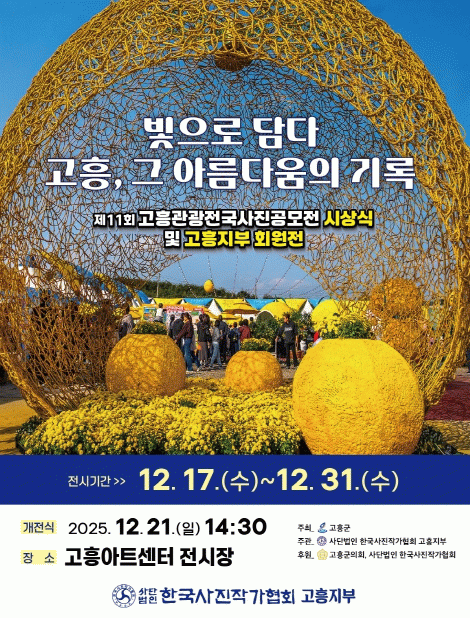 한편, 제11회 고흥관광 전국 사진 공모전 시상식은 오는 12월 21일 오후 2시 30분, 고흥아트센터 1층 전시실에서 개최될 예정이다.