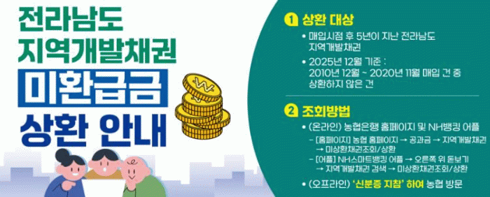 윤진호 전남도 기획조정실장은 “일제상환 기간 운영을 통해 지역개발채권 미환급금을 최소화해 도민의 정당한 권리를 보호하겠다”고 말했다.