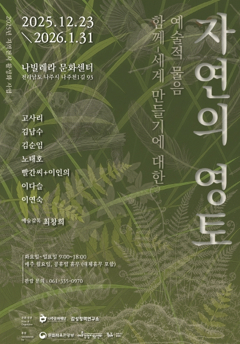 17일 나주문화재단(이사장 윤병태)에 따르면 문화체육관광부와 예술경영지원센터가 주관한 ‘2025년 지역전시 활성화 사업 유형3 미술콘텐츠-전시공간 매칭 지원’ 공모에 선정돼 전시 ‘자연의 영토 함께-세계만들기에 대한 예술적 물음’을 오는 12월 23일부터 2026년 1월 31일까지 나빌레라문화센터에서 개최한다.