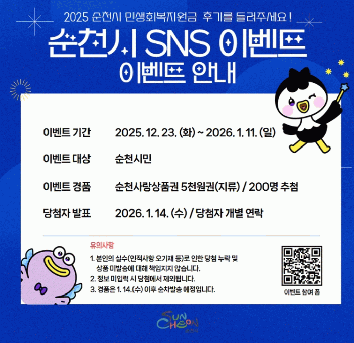 참여자 가운데 200명을 추첨해 순천사랑상품권 5천원권(지류)을 제공하며, 당첨자는 2026년 1월 14일 개별 안내할 예정이다.