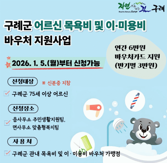 이번 사업은 구례군에 주민등록을 두고 거주하는 75세 이상 어르신 약 4,900명을 대상으로 하며, 연간 6만원(반기별 3만원)의 바우처카드를 제공한다.