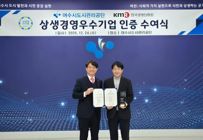 여수시도시관리공단 이사장은 “이번 상생경영 우수기업 재인증은 공단이 추진해온 지역사회 상생 노력과 ESG 경영 실천이 다시 한 번 인정받은 결과”라며, “앞으로도 지속 가능한 상생경영을 실천해 시민이 체감할 수 있는 사회적 가치를 창출해 나가겠다”고 말했다.