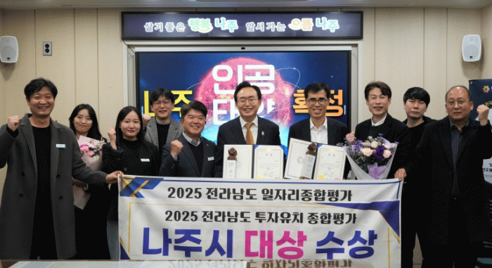 나주시는 지난 24일 여수엑스포컨벤션센터에서 열린 ‘2025년 전라남도 일자리·경제 한마당’ 행사에서 일자리 창출과 투자유치 2개 부문에서 각각 최고상인 ‘대상’을 수상했다고 26일 밝혔다.