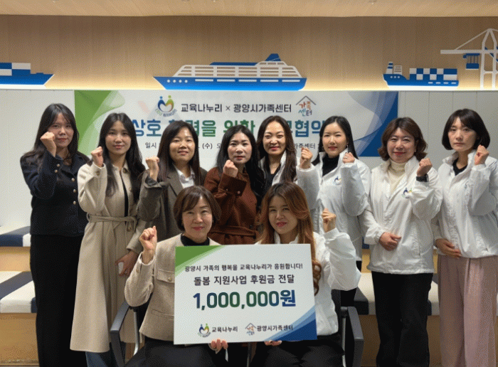 협약식과 함께 열린 후원금 전달식에서는 교육나누리가 광양시가족센터 돌봄지원팀에 후원금 100만 원을 기탁했으며, 해당 후원금은 가족 대상 돌봄지원사업인 ‘공동육아나눔터’ 프로그램 운영에 활용될 예정이다.