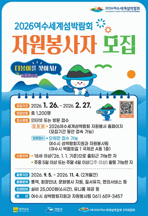 한편, 2026여수세계섬박람회는 ‘섬, 바다와 미래를 잇다’를 주제로 돌산 진모지구 일원에서 개최될 예정이며, 시는 섬박람회에 함께할 자원봉사자를 오는 2026년 1월 26일부터 2월 27일까지 모집한다.