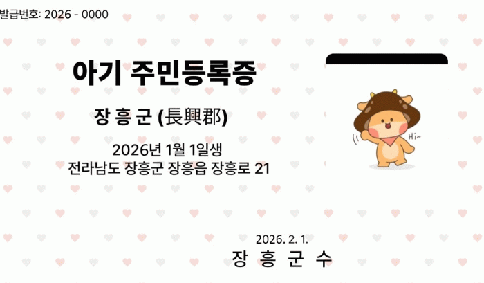 장흥군 관계자는 “아기 주민등록증을 통해 아이의 출생을 기념하며, 가족들에게 따뜻한 추억이 되길 바란다”며 “앞으로도 다양한 출산 장려 정책을 마련해 아이 키우기 좋은 장흥을 만들겠다”고 밝혔다.