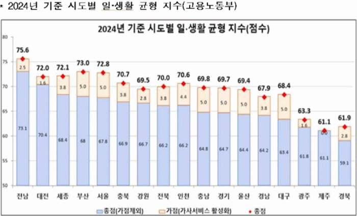 2024년 일·생활 균형지수 평가 결과, 전국 17개 시·도 평균은 65.7점이며 전남은 이보다 7.4점 높았은 점수를 기록했다.