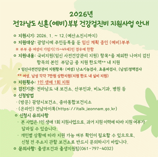 ‘전라남도 신혼(예비)부부 건강검진비 지원사업’은 임신을 계획 중인 부부가 건강 상태를 사전에 점검하고, 건강한 임신·출산을 준비할 수 있도록 국비 지원사업인 ‘임신 사전건강관리 지원’ 항목을 제외한 검진 항목에 대한 본인부담금을 지원하는 사업이다.