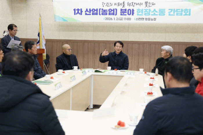 강진군이 지난 2일 신전면에 있는 영동농장영농조합법인에서 지역 농업인의 목소리를 직접 듣기 위한 1차 산업(농업) 분야 현장 소통 간담회를 개최했다.