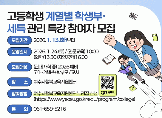 모집기간은 1월 13일부터로 참여를 희망하는 학생과 학부모, 교사는 여수시행복교육지원센터 누리집에서 신청할 수 있으며, 자세한 문의사항은 평생교육과로 연락하면 된다.