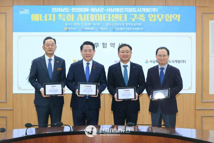 해남군은 8일 전남도-한전KDN-서남해안기업도시개발(주)와 에너지특화 AI데이터센터 구축을 위한 업무협약을 체결했다. 협약식에는 명현관 해남군수를 비롯해 김영록 전남도지사, 박상형 한전KDN 사장, 김대한 서남해안기업도시개발(주) 대표가 참석했다.
