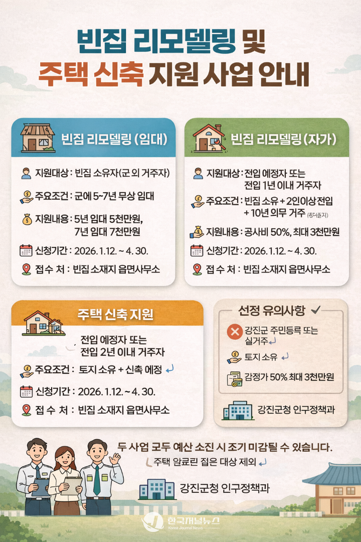 두 사업 모두 예산 소진 시 조기 마감될 수 있으며, 세부 요건 충족 여부에 따라 대상자 선정이 제한될 수 있다. 자세한 내용은 강진군청 인구정책과 주거지원팀( 061-430-3073, 3088) 또는 각 읍·면사무소로 문의하면 된다.