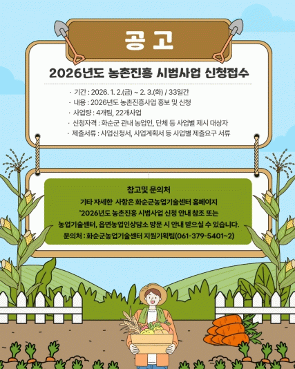 자세한 사업 내용은 화순군청 및 화순군농업기술센터 누리집에 게시된 ‘2026년 농촌진흥 시범사업 신청 공고’를 통하여 확인할 수 있으며, 사업 대상자는 현장 심사와 농업산학협동심의회 심의 등을 거쳐 최종 선정된다.