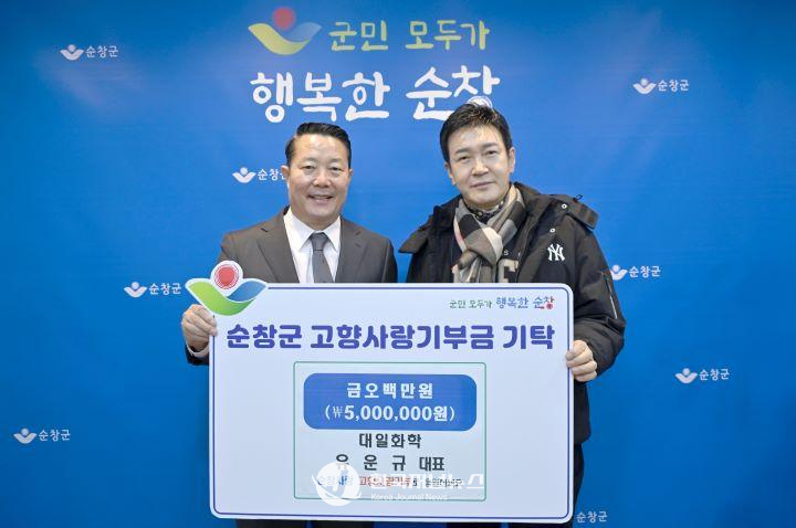 순창군 적성면 출신인 유운규 대표는 현재 대일화학을 운영하며 활발한 경영 활동을 펼치고 있다. 유 대표는 평소에도 고향에 대한 남다른 애착을 가지고 지난 2023년에도 고향사랑기부금 500만원을 기탁하는 등 고향 발전을 위한 일에 앞장서 온 것으로 알려졌다.