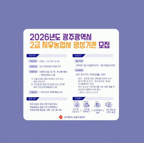 신청은 지정신청서·운영계획서 등 필요 서류를 준비해 농업기술센터를 방문하거나 등기우편(광산구 평동로 639-22, 치유농업팀), 온라인으로 하면 된다.