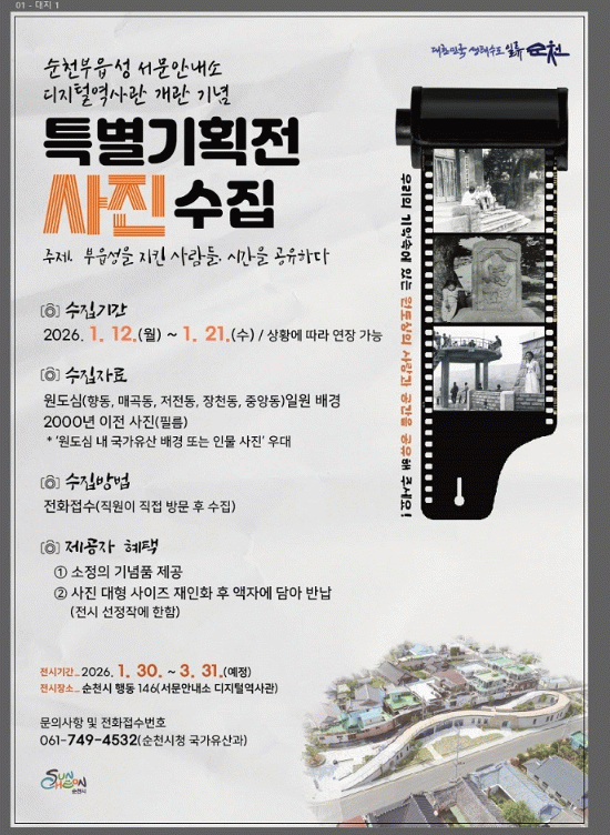 접수는 오는 21일까지 가능하며, 사진 제공 희망자가 순천시 국가유산과로 문의하면 담당자가 직접 방문해 수집한다.