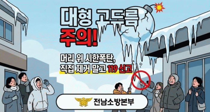이에 전남소방은 ▲건물 옥상이나 배수관 등 눈이 쌓이기 쉬운 곳 수시 점검 ▲보행 시 건물 외벽과 거리를 두고 걷기 ▲대형 고드름 발견 시 주변 통제선 설치 등 안전 조치 후 즉시 119에 신고할 것을 권고했다.
