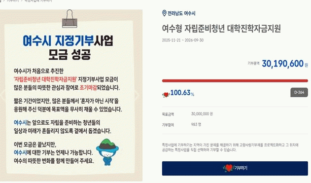 시 관계자는 “여수 고향사랑기부제에 적극 참여해 준 모든 기부자분들께 깊이 감사드린다”라며, “세제 혜택이 더욱 확대되는 만큼, 앞으로도 많은 분들이 여수시와 소중한 인연을 맺고 지역 발전에 동참할 수 있도록 매력적인 답례품과 기부자가 공감하는 기금 사업을 지속적으로 발굴해나가겠다”라고 밝혔다.