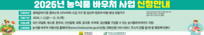 박상미 전남도 농식품유통과장은 “농식품 바우처 사업을 통해 취약계층이 신선한 농식품을 보다 쉽게 접하고 지역 농산물 소비 활성화에도 기여하도록 지원하겠다”며 “특히 올해부터 청년층까지 지원 대상을 확대해 더 많은 가구가 혜택을 누리도록 적극 홍보하겠다”고 말했다.