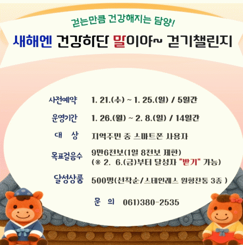 참여 기간 동안 총 9만 6,000보를 달성한 참가자 중 선착순 500명에게 상품을 증정하며, 하루 최대 걸음 수는 8,000보로 제한한다.