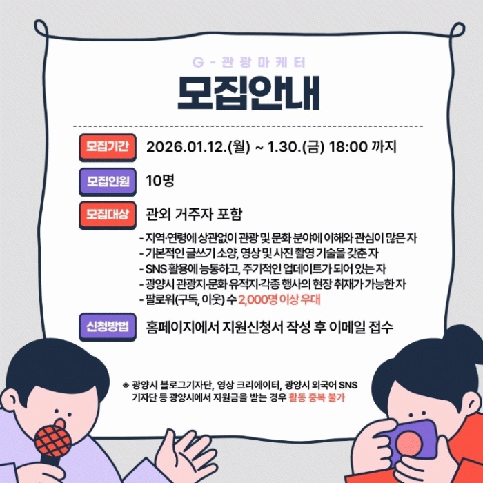 관광·문화 분야에 관심이 있다면 거주지와 연령에 제한 없이 지원할 수 있으며, 팔로워 수 2,000명 이상인 지원자는 우대한다.