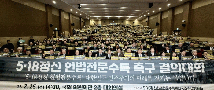 우원식 국회의장은 “국민 여론조사에서 압도적 다수가 헌법개정과 5·18수록에 찬성했다. 대통령은 개헌을 통한 5·18정신 헌법전문수록을 수차례 약속했고, 국회는 국민투표법을 통과시켜 개헌의 첫발을 뗐다”며 “1988년 2월25일 시행된 현행 헌법이 38년이 된 오늘, 민주주의 방벽을 보완하고 5·18정신을 반드시 헌법전문에 새기는 것이 내란극복을 완성하는 길이다”고 말했다.