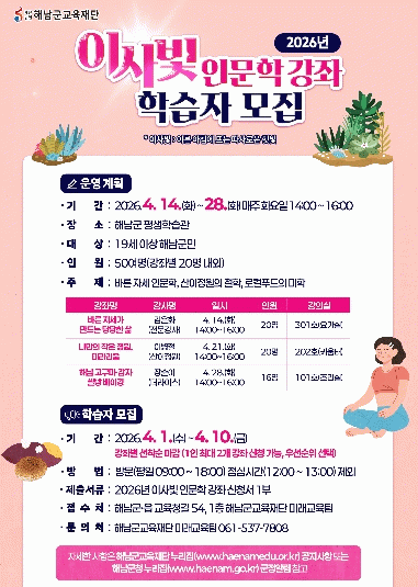 해남군교육재단은‘해남 이사빛 인문학 강좌’를 통해 군민의 인문학적 이해와 건강 증진, 지역 문화 활성화를 도모하고 앞으로도 평생교육 프로그램을 확대해 군민 학습권 보장과 삶의 질 향상에 기여할 계획이다.