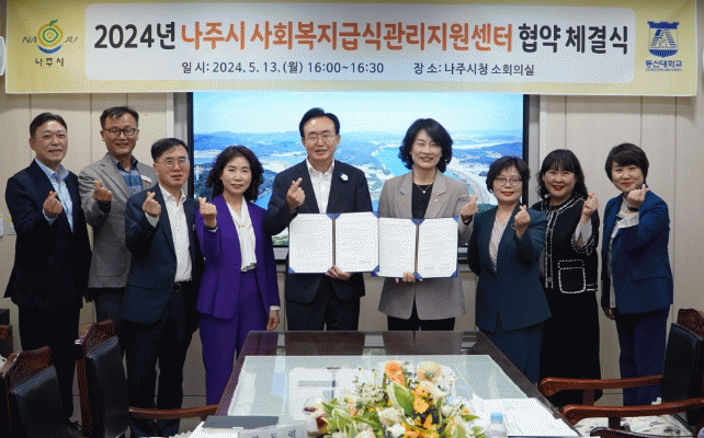 이번 협약식은 관내 사회복지급식소를 대상으로 급식 위생・안전관리와 양 기관의 협력 체계 구축을 위해 마련됐으며 윤병태 나주시장, 아주희 동신대학교 총장을 비롯한 관계자 7명이 참석했다.