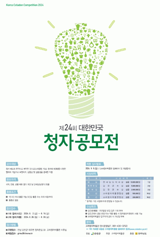 공모전 모집 대상은 청자 태토와 유약으로 제작한 창작품으로 국적과 나이 관계없이 누구나 1인 최대 2건까지 응모할 수 있다.