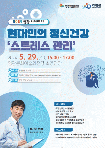 이번 강연은 신경정신과 전문의 표진인 원장을 초청해‘현대인의 정신건강, 스트레스 관리’를 주제로 실제 상담사례를 통해 만병의 근원인 스트레스를 직접 진단하고 해소하는 방법을 소개할 예정이다.