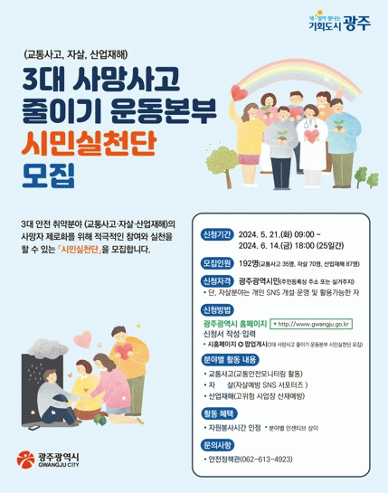 대상은 주민등록상 주소 또는 실거주지가 광주광역시인 광주시민이며, ▲교통 35명 ▲자살 70명 ▲산업재해 87명 등 총 192명을 모집한다. 단 자살분야는 개인 사회관계망서비스(SNS) 활용이 가능해야 한다.
