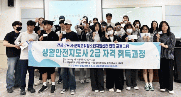 이번 자격증 취득 과정은 전라남도 5개 시군 학교밖청소년지원센터가 함께 한 연합 프로그램으로 (사)생활안전보건연합의 지도 아래 △생활 안전, △팀소생술, △생활 응급처치(외상편)에 대한 이론 교육과 △성인 심폐소생술, △자동심장충격기, △소독, △붕대, △부목 방법 등의 실습 과정으로 진행됐다.