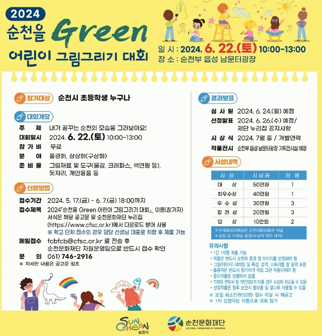 순천문화재단 관계자는 “이번 대회를 통해 자라나는 어린이들의 꿈과 희망을 높일 수 있는 계기가 되길 바란다”고 말했다.
