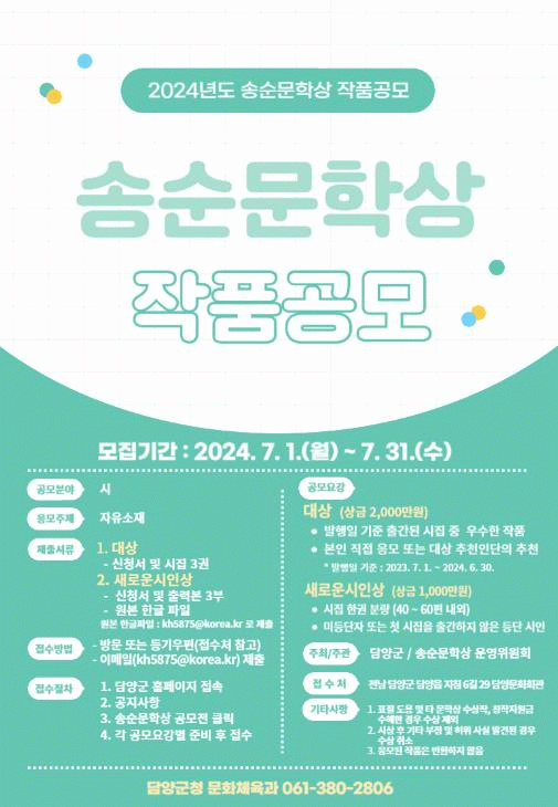 이번 송순문학상은 2개 부문으로 ‘대상’ 부문과 ‘새로운시인상’ 으로 구성되며, 대상 수상자에게는 상금 2,000만 원, 새로운시인상 수상자에게는 1,000만 원을 수여한다.