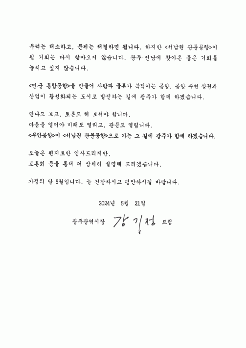 강기정 광주광역시장은 21일 “무안공항에 대해 드리고 싶은 말씀이 많아 펜을 들었다”며 무안군민에게 드리는 ‘약속의 편지1’를 띄웠다.