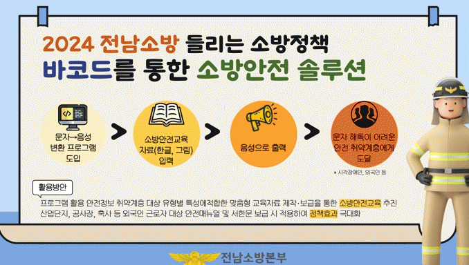 소방서에서는 외국인 주민과 문자 해독이 어려운 안전 취약계층의 안전 지원을 위해 들리는 바코드를 통해서 소방안전 솔루션을 제공하는 것이다.