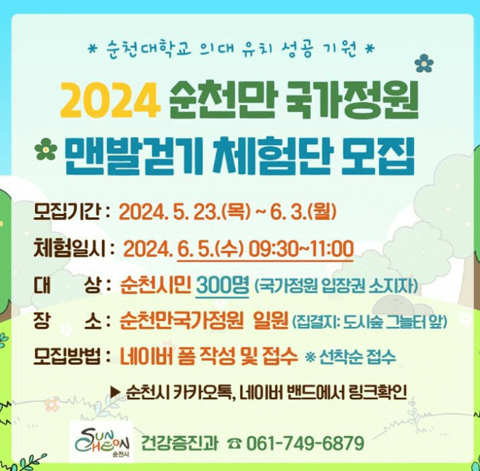 이번 행사는 순천대 의대유치 성공기원 시민 퍼포먼스, 맨발걷기 특강, 스트레칭 후 국가정원 맨발걷기 체험 코스로 구성돼 있다.