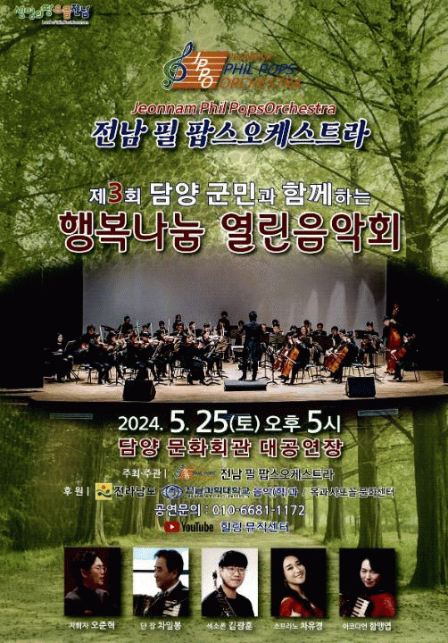 전남 필 팝스오케스트라는 지난 2월 순천문화예술회관 공연을 시작으로 전남 지역민들에게 음악의 힘으로 위안과 힐링의 시간을 제공하고자 전남권 순회공연을 진행하고 있으며, 이번 공연은 담양군민과 함께하는 행복 나눔 테마로 다양한 곡들을 공연할 예정이다.