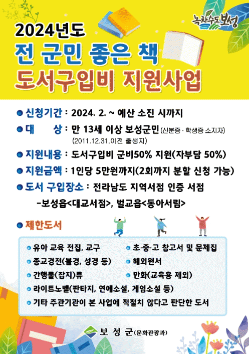 ‘전 군민 좋은 책 도서 구입 지원사업’은 보성군민(주민등록상 13세 이상 보성군 거주자) 또는 지역 소재 중고등학생에게 도서 구입비의 일부를 지원해 주는 사업이다.