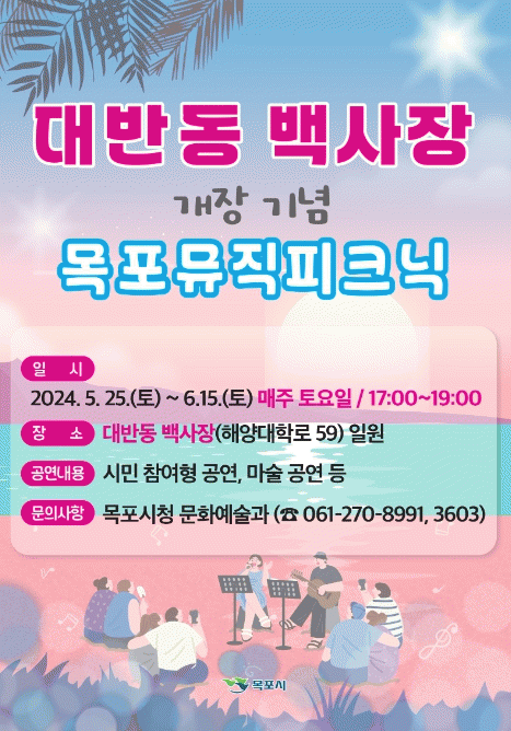 목포시는 새로운 랜드마크로 떠오른 대반동 백사장에서 시민이 참여하는 거리공연인 목포뮤직피크닉을 선보인다. 이 공연은 오는 25일 시작해 6월 15일까지 매주 토요일 오후 5시 총 4회에 걸쳐 진행된다.