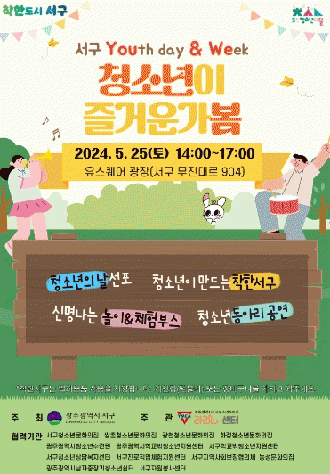 서구는 지난 3월 이같은 내용의 조례를 제정하고 오는 25일 유스퀘어 광장에서 ‘제1회 청소년의 날’기념식을 개최한다. 이날 기념식은 ‘청소년이 즐거운가봄’을 주제로 서구 청소년의 날 선포, 착한서구 청소년 헌장 낭독, 모범 청소년 및 청소년 육성‧보호 유공자 표창 순으로 진행된다.