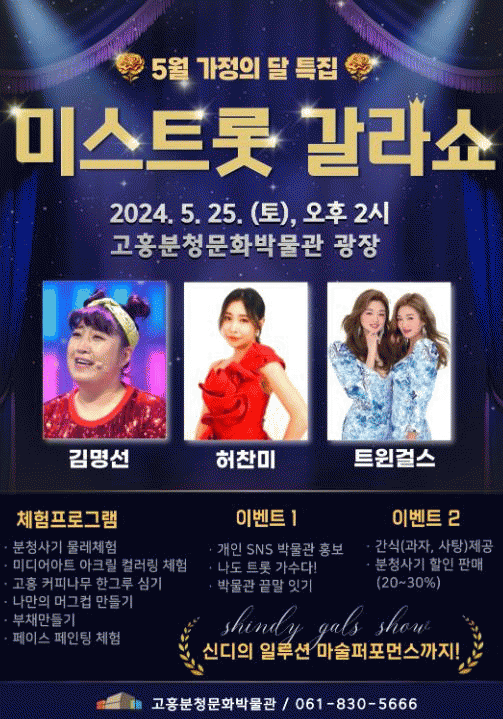 이번 행사는‘가정의 달 효도는 분청에서’라는 주제로 ▲박물관 무료 관람 ▲미스트롯 갈라쇼 ▲마술쇼 공연 ▲분청사기 물레 체험 ▲고흥 커피나무 한 그루 심기 ▲박물관 끝말잇기 대결 등 풍성하고 다양한 프로그램을 관람객들에게 선보일 계획이다.