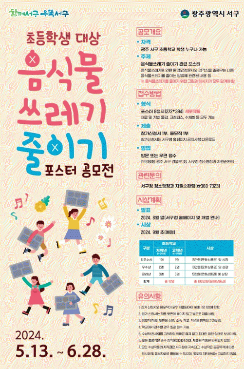 채봉길 청소행정과장은 “이번 공모전을 통해 어린이들의 올바른 환경의식을 함양하고 음식물쓰레기 감량의 중요성을 높일 수 있도록 노력하겠다”며 “서구 초등학생들의 창의적이고 참신한 작품이 출품될 수 있도록 많은 관심과 참여를 바란다”고 말했다.