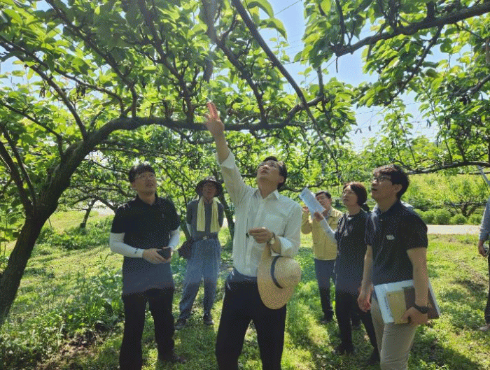 감 농가는 개화 시기에 맞춰 꽃봉오리를 제거하는 ‘적뢰’와 수정 관리를, 배 농가는 봉지 씌우기 전 열매를 솎는 ‘적과’와 흑성병 방제를 서두르고 있다.
