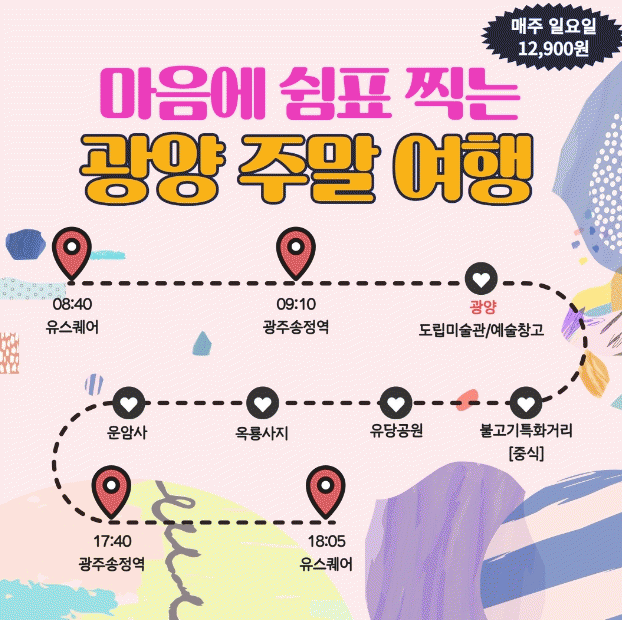 매주 일요일 광주 유스퀘어(8시 40분) 2번 홈 또는 광주송정역(9시 10분) 택시승강장에서 탑승해 전남도립미술관, 광양예술창고 등을 먼저 관람한다.