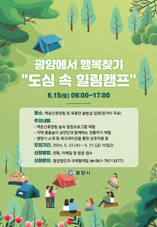 ‘숲속 힐링 체험행사’는 6월 15일 백운산휴양림과 옥룡면 솔밭섬 일원에서 열리며, 지역 내 거주 외국인의 광양 생활에 대한 만족도를 높여 포용적인 도시 분위기를 조성하기 위해 마련됐다.