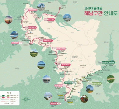 코리아둘레길은 한반도 외곽을 따라 이어진 약 4,500㎞의 초장거리 걷기길로, 해남구간은 남파랑길과 서해랑길의 총 12개 코스가 조성되어 있다. 송지면 땅끝마을의 땅끝탑에서 서해랑길이 시작되고, 남파랑길이 끝나면서코리아 둘레길의 가장 중요한 거점으로 꼽힌다.