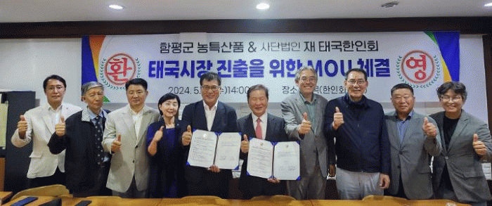 이상익 함평군수는 29일 ‘2024년 방콕국제식품박람회’가 개최되는 방콕 소재 태국한인회관에서 전용창 (사)재태국한인회장을 만나 수출지원에 관한 업무협약을 체결했다.