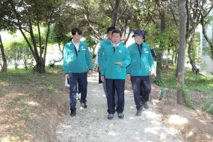 이어 도심권 내 녹지대 속에서 시민들이 산책과 운동, 휴식을 즐길 수 있도록 추진 중인 컨부두사거리 일원 시민건강산책로 조성사업 현장을 찾아 주변 조경수와의 조화 및 수목 생육환경 등을 면밀히 점검했다.