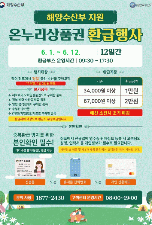 국내산수산물 온누리상품권 환급행사는 수산물 체감물가 완화와 소비 활성화를 도모하고자 매년 명절과 상반기에 집중 실시해 수산물 소비 촉진과 전통시장 활성화에 기여하고 있다.